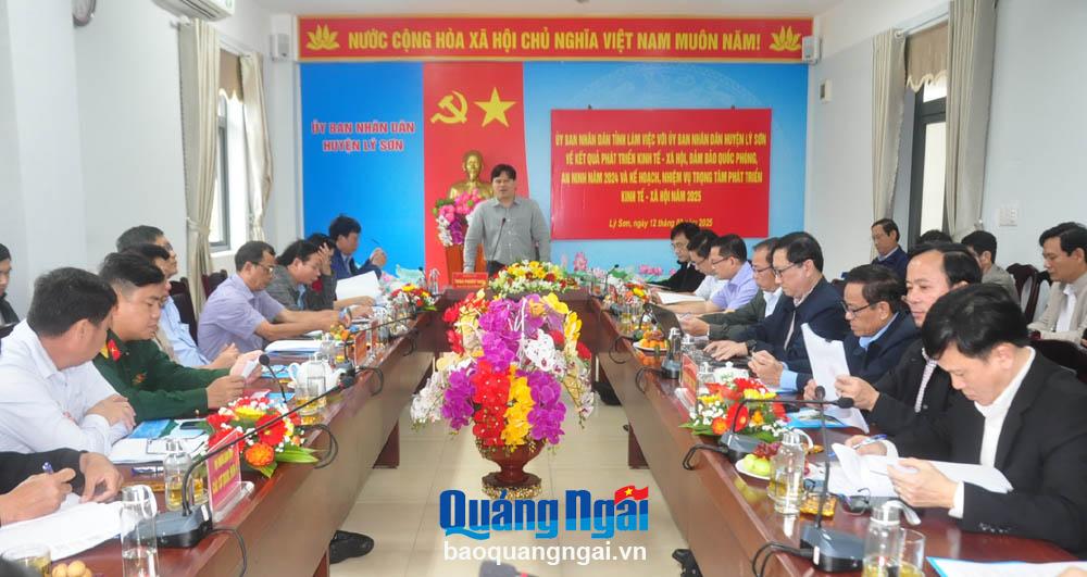 Tại buổi làm việc, lãnh đạo huyện Lý Sơn kiến nghị UBND tỉnh có chính sách đặc thù đối với huyện Lý Sơn và đề xuất cơ chế chính sách thu hút, kêu gọi nhà đầu tư có tiềm lực xây dựng cơ sở hạ tầng phát triển du lịch huyện đảo Lý Sơn. Quan tâm về cơ chế chính sách đối với huyện đảo đặc biệt khó khăn theo cơ chế đặc thù để cán bộ, công chức, viên chức, người lao động và nhân dân huyện đảo an tâm công tác, giữ gìn, xây dựng và bảo vệ quê hương biển đảo...