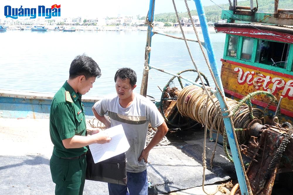 Cán bộ Trạm Kiểm soát Biên phòng Sa Huỳnh (TX. Đức Phổ) tuyên truyền, hướng dẫn ngư dân thực hiện các quy định trong chống khai thác IUU.