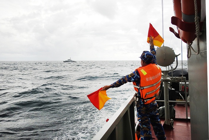Tàu hải quân hai nước huấn luyện cờ tay trong quá trình tuần tra.