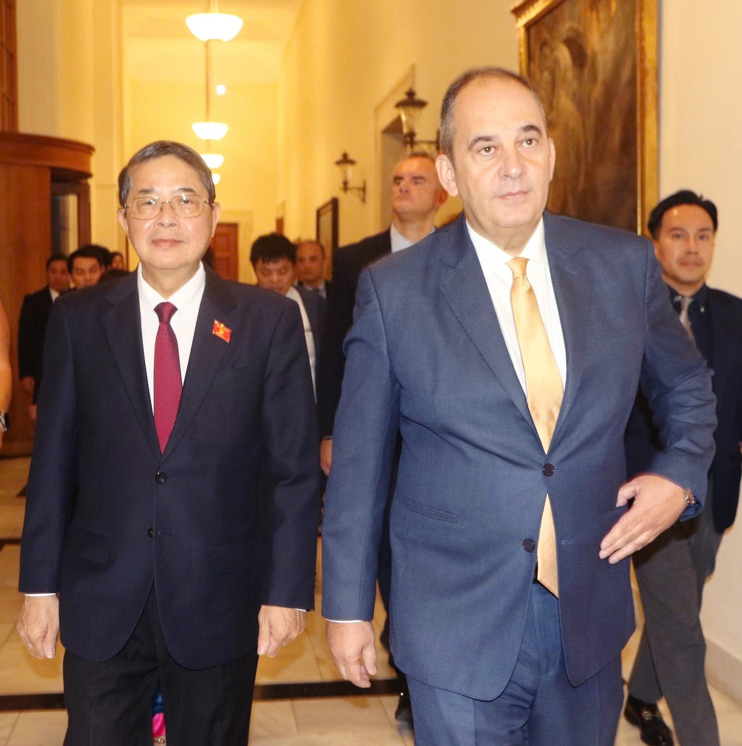 Hai bên bày tỏ hài lòng trước những tiến triển tốt đẹp giữa Quốc hội Việt Nam với Quốc hội Hy Lạp nói riêng, cũng như hai nước nói chung thông qua việc duy trì trao đổi đoàn và tiếp xúc các cấp, trong đó có các đoàn ủy ban chuyên môn của Quốc hội; nhất trí thúc đẩy trao đổi đoàn cấp cao, cũng như tăng cường tiếp xúc, trao đổi đoàn giữa Quốc hội hai nước, nhất là lãnh đạo Quốc hội, Nhóm Nghị sĩ hữu nghị, nhằm trao đổi thông tin, kinh nghiệm trên các lĩnh vực lập pháp, giám sát, xây dựng khuôn khổ pháp luật nhằm thúc đẩy hợp tác trong các lĩnh vực còn nhiều dư địa, phù hợp với nhu cầu phát triển của hai nước như lao động, năng lượng tái tạo, chuyển đổi xanh, chuyển đổi số, công nghệ tài chính, vận tải biển...; duy trì các cơ chế hợp tác song phương hiện có, ủng hộ các sáng kiến của nhau, tăng cường phối hợp tại các diễn đàn đa phương, quốc tế và các diễn đàn liên nghị viện khu vực và thế giới như IPU, ASEP, APF để đóng góp cho hoà bình, hợp tác và phát triển ở trên khu vực và thế giới.