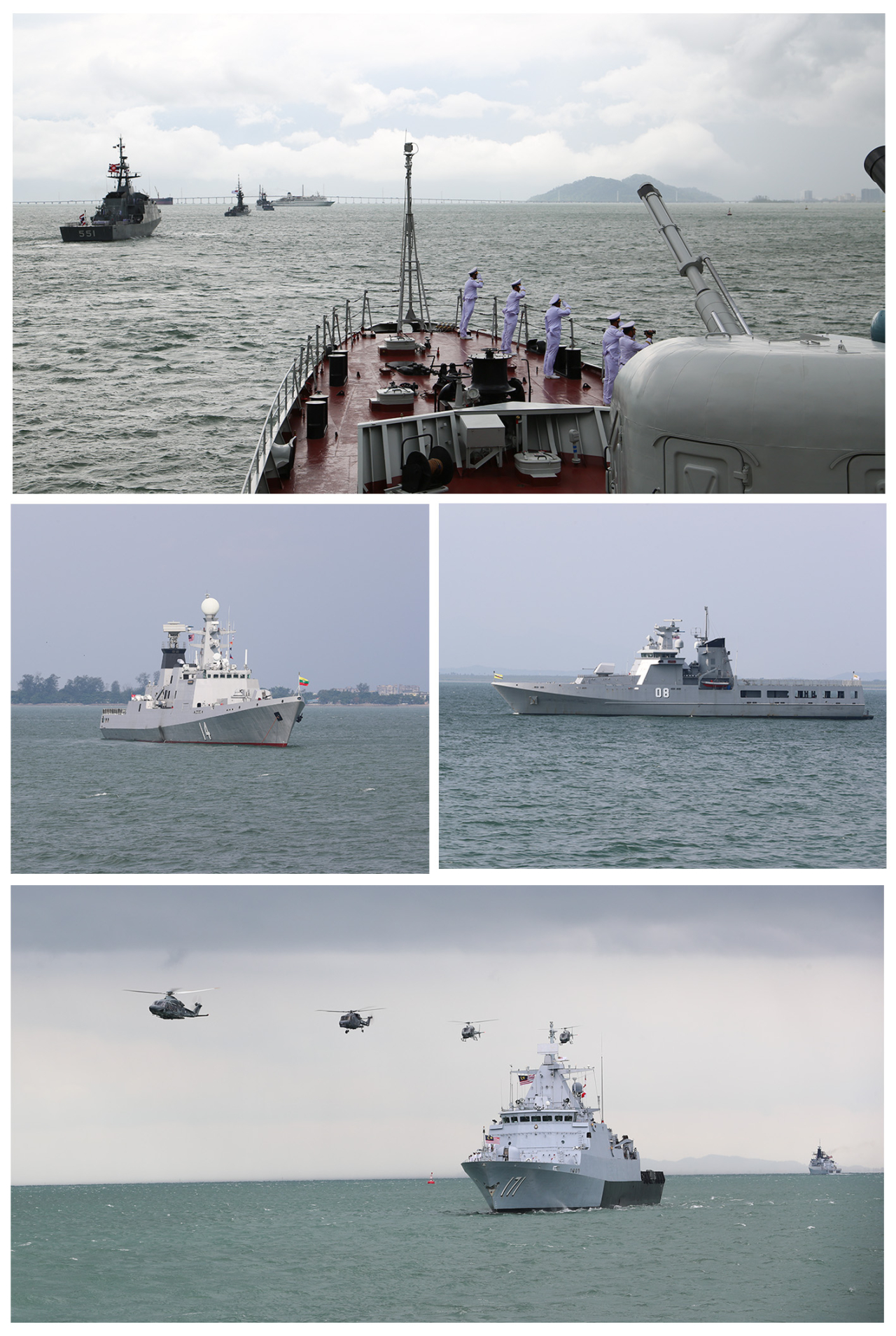 Tàu 016-Quang Trung cùng với tàu Hải quân các nước ASEAN và máy bay trực thăng của Hải quân Hoàng gia Malaysia trong lễ duyệt binh tàu