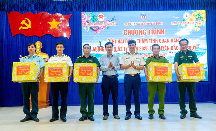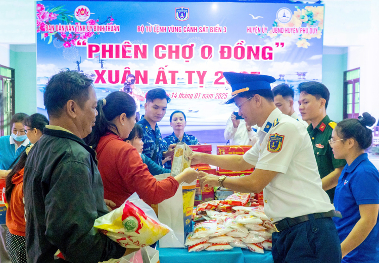 Chiều tối cùng ngày, tại huyện đảo Phú Quý, chương trình "Phiên chợ Tết 0 đồng" đã được tổ chức, mang lại niềm vui cho 100 bà con ngư dân và gia đình chính sách có hoàn cảnh khó khăn thông qua các phiếu mua hàng miễn phí. Tiếp nối là chương trình giao lưu văn hóa nghệ thuật với chủ đề "Tết hải đảo - Thắm tình quân dân, đón Xuân Ất Tỵ 2025", trong đó 40 suất quà đã được trao tặng cho gia đình chính sách, ngư dân và học sinh khó khăn. Đồng thời, hội thi "Gói bánh chưng xanh" cũng được tổ chức, tạo không khí rộn ràng và ý nghĩa cho ngày cận Tết.
