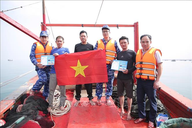 Đại diện Vùng Cảnh sát biển 1 tặng cờ và phát tờ rơi cho ngư dân đang khai thác hải sản tại vùng biển Cô Tô, Quảng Ninh. Ảnh: TTXVN