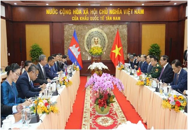 Thủ tướng bày tỏ vui mừng khi những năm gần đây, quan hệ Việt Nam - Campuchia tiếp tục đà phát triển mạnh mẽ, thực chất, hiệu quả trên tất cả các lĩnh vực. Đặc biệt, hợp tác kinh tế - thương mại - đầu tư phát triển ấn tượng, trong đó thương mại biên giới là điểm sáng nổi bật. Các cửa khẩu quốc tế dọc tuyến biên giới Việt Nam - Campuchia đóng vai trò quan trọng trong kết nối hai nền kinh tế với kim ngạch thương mại song phương những năm gần đây luôn duy trì bình quân khoảng 10 tỷ USD/năm (dự kiến năm 2025 có thể đạt 12 tỷ USD).